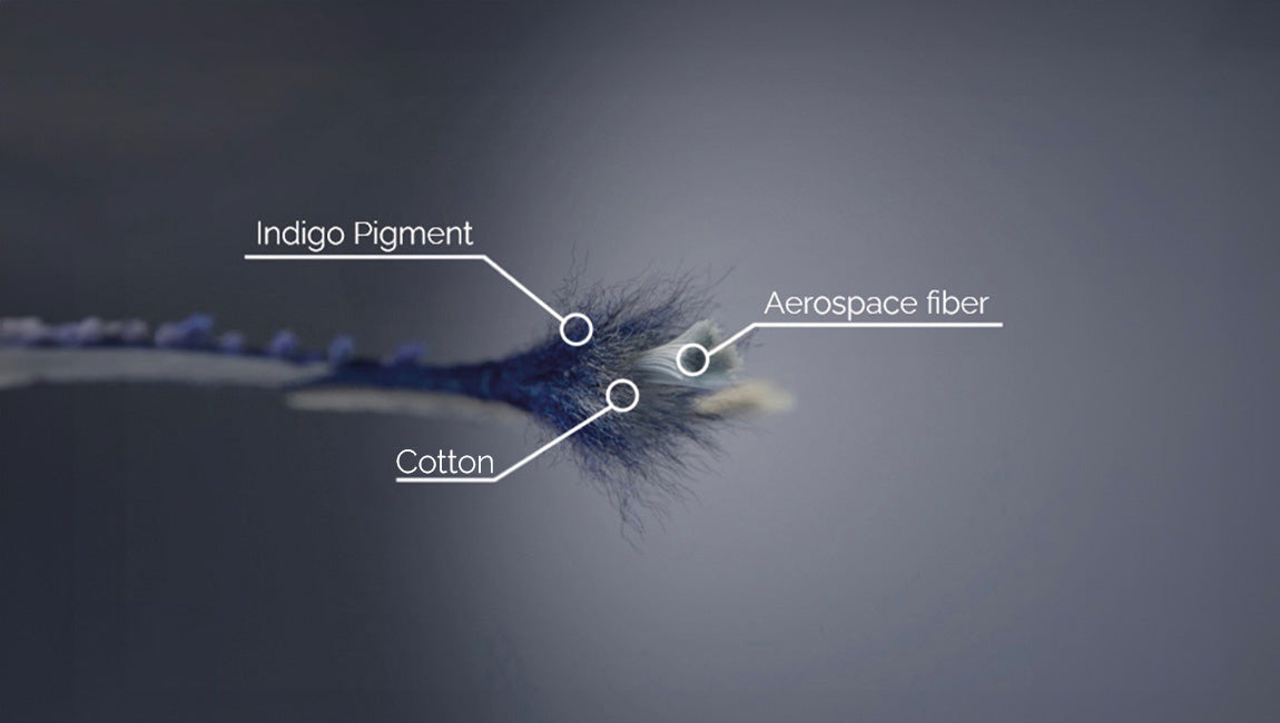 This stiff, sturdy fiber is surrounded by natural indigo-dyed cotton, so all the performance is hidden beneath an authentic, comfortable look.