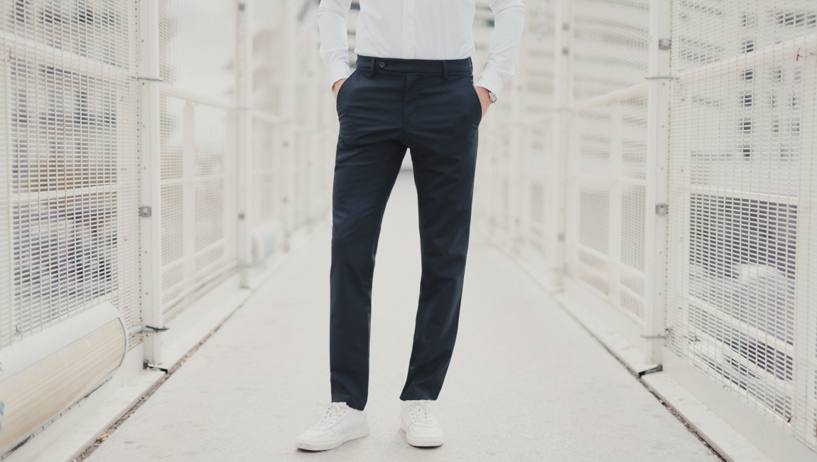 These pants have no pleats or center crease so you can wear them with sneakers or dress shoes.