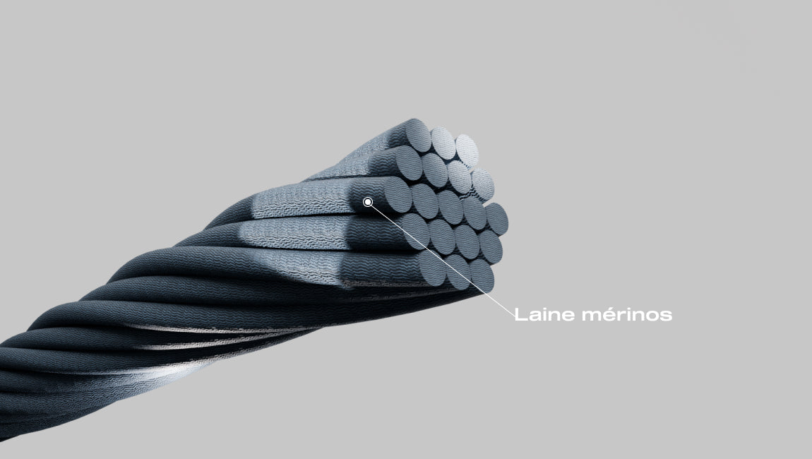 La laine mérinos est une fibre naturelle ultra-performante : douceur, respirabilité, évacuation rapide de la transpiration, thermorégulation et neutralisation des odeurs pour une fraîcheur durable, en toute situation. Nous utilisons de la laine mérinos extrafine issue de filières certifiées sans mulesing.