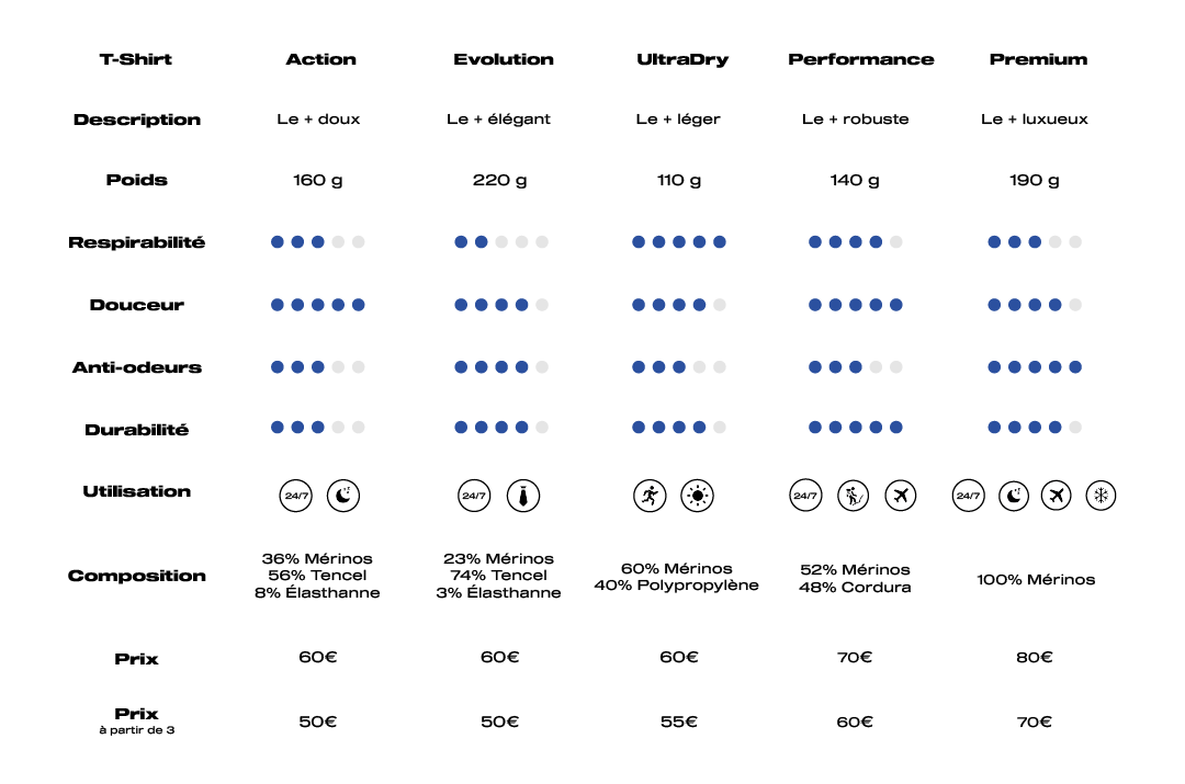 L'action Merino T-Shirt est le modèle emblématique de notre marque, le plus connu et le plus apprécié par nos clients.