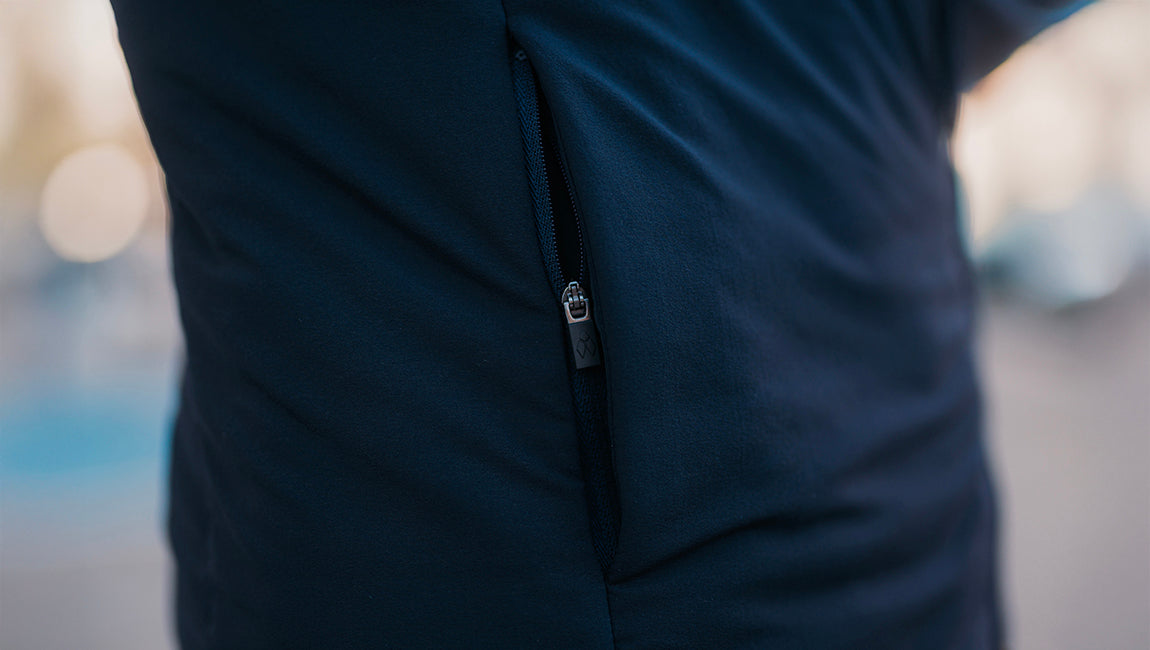 Ses poches zippées discrètes, parfaitement intégrées à la coupe, offrent un espace sécurisé sans casser la fluidité de la silhouette.