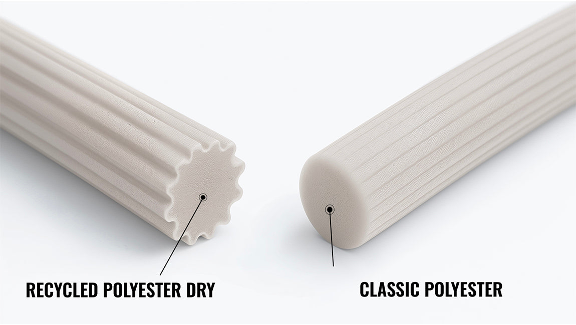 Loin du polyester bas de gamme, on a choisi un fil recyclé haut de gamme, avec une structure cannelée en étoile.