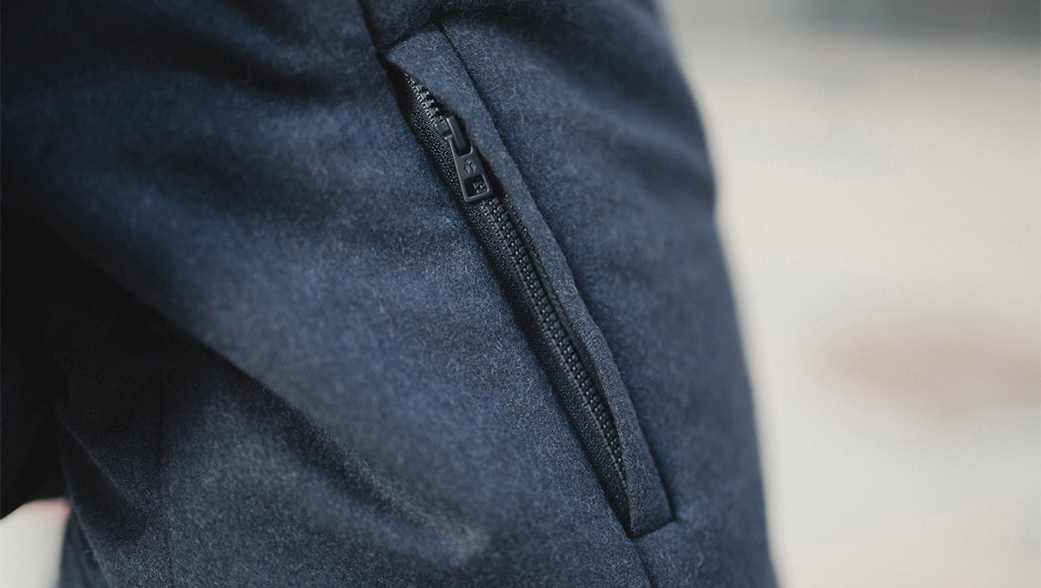 Les poches sont zippées et les zips sont logotés en coloris mat ton sur ton.