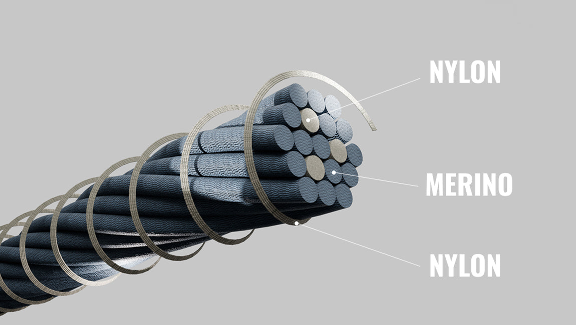 Le fil utilisé ici utilise une âme en laine mérinos et polyamide recyclé, le tout entouré par un filament résistant de polyamide recyclé.