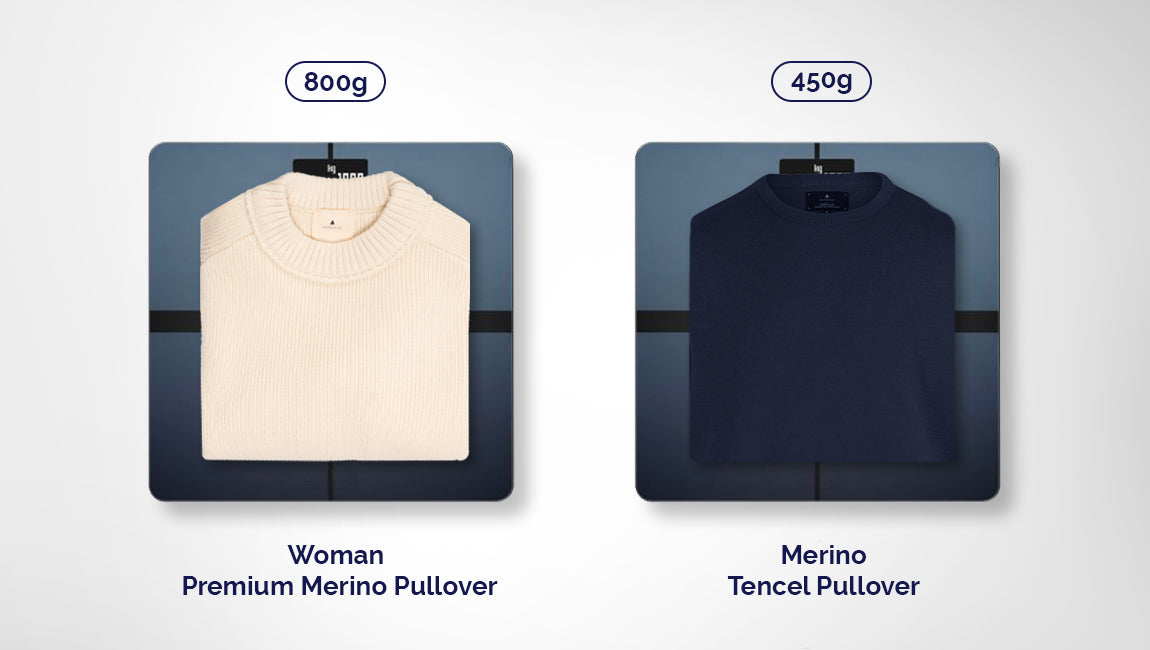 Presque 2 fois plus lourd et plus chaud que notre pull historique Woman Merino Pullover et son poids “standard” de 450g.